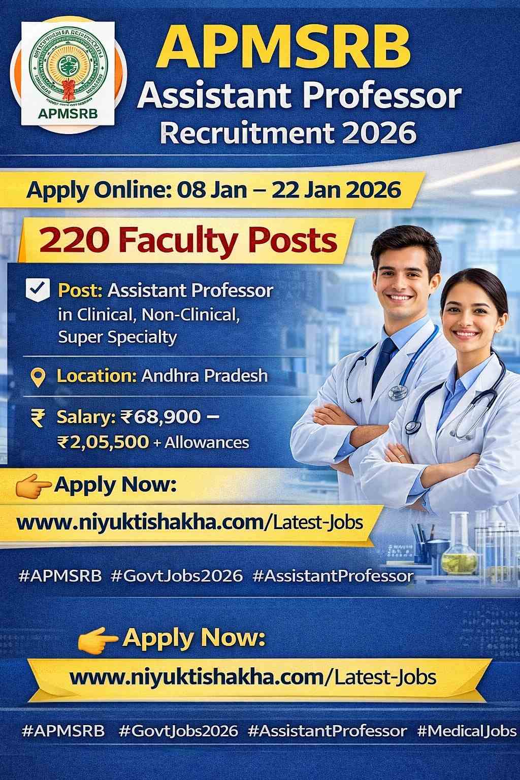 Short Information : The Andhra Pradesh Medical Services Recruitment Board (APMSRB) has officially released the APMSRB Assistant Professor Recruitment 2026 Notification on 1 January 2026. A total of 220 regular vacancies have been announced for Assistant Professor posts in Clinical, Non-Clinical, and Super Specialty departments under the Directorate of Medical Education (DME), Andhra Pradesh.