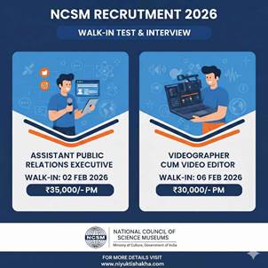 National Council of Science Museums (NCSM), an autonomous organization under the Ministry of Culture, Government of India, has released Advertisement No. 01/2026 for Walk-In Test and Interview to engage Young Professionals on a contract basis in the field of Public Relations and Media.