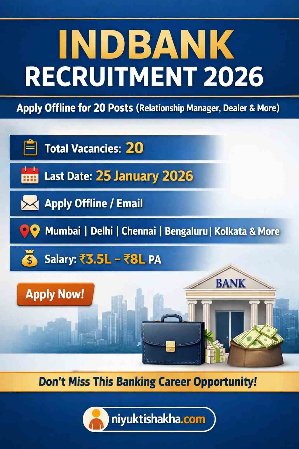 Tags : Indbank Recruitment 2026 | Indbank Vacancy 2026 | Relationship Manager Jobs 2026 | Dealer Jobs 2026 | Banking Jobs 2026 | Indian Bank Subsidiary Recruitment | Merchant Banking Jobs India | Finance Jobs India | MBA Jobs 2026 | Bank Private Jobs | Indbank Apply Offline | Latest Banking Vacancy | Chennai Bank Jobs | Mumbai Finance Jobs | Delhi Banking Vacancy | Bengaluru Bank Vacancy | Ahmedabad Jobs | Surat Jobs | Indore Jobs | Jaipur Jobs | Niyuktishakha Jobs