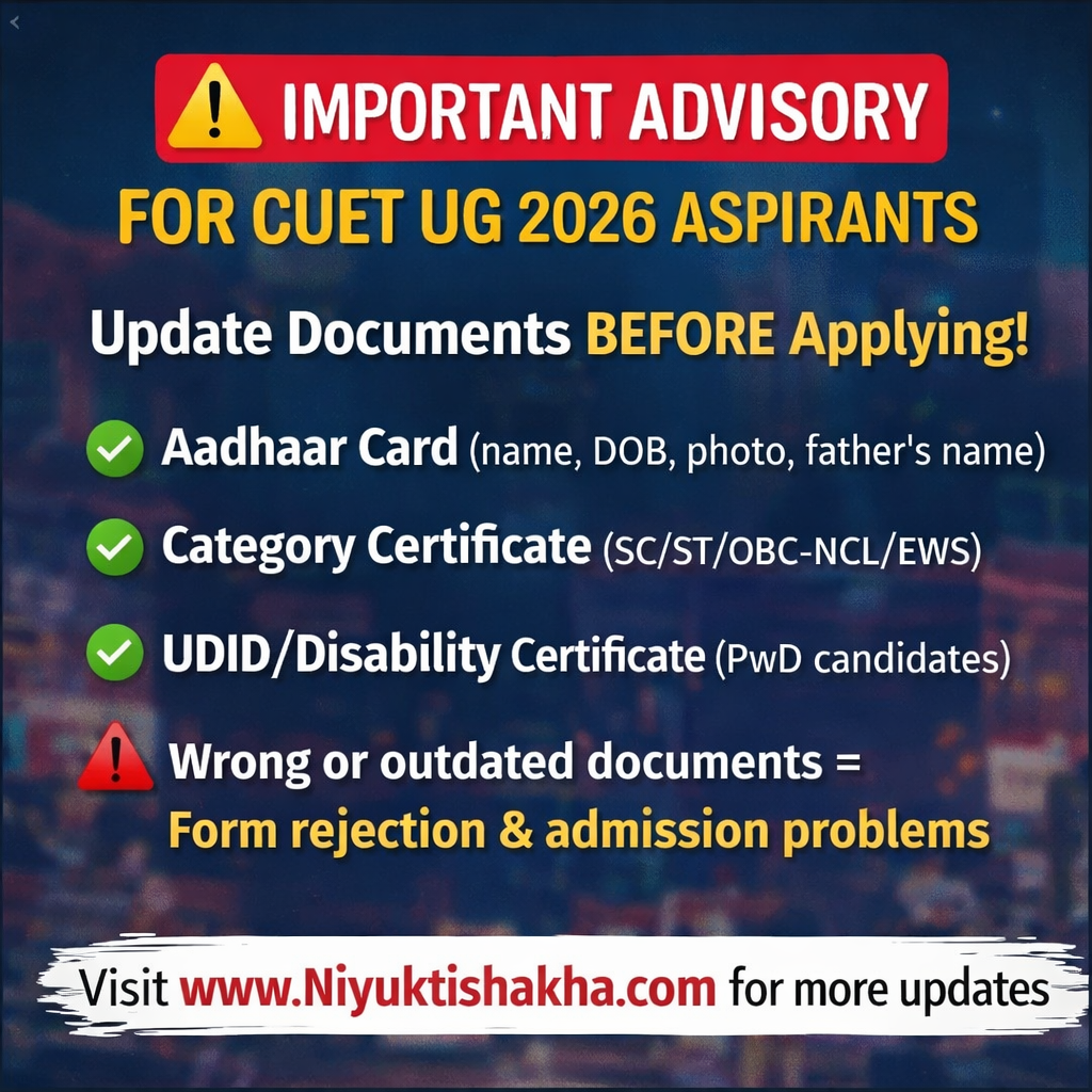 CUET UG 2026, CUET UG Advisory, CUET UG Documents, CUET UG Aadhaar Update, CUET UG Application Tips, CUET UG 2026, CUET UG Advisory, CUET UG Notification 2026, CUET UG Apply Online, CUET UG Documents Required, CUET UG Aadhaar Card Update, CUET UG Category Certificate, CUET UG PwD Certificate, CUET UG UDID Card, CUET UG Application Form 2026, CUET UG Exam Date 2026, CUET UG NTA Advisory, CUET UG Important Instructions, CUET UG Admission Process, CUET UG Counselling 2026, CUET UG Form Rejection Reasons, CUET UG Data Mismatch, CUET UG Reservation Rules, CUET UG SC ST OBC EWS Certificate, CUET UG Admit Card Issues, CUET UG Identity Verification, CUET UG Latest Update, CUET UG Official Notice, CUET UG Student Advisory, CUET UG Exam Preparation Tips, CUET UG Correction Window, CUET UG Helpdesk, CUET UG Application Checklist, CUET UG Eligibility Verification, CUET UG University Admission, CUET UG National Entrance Exam, CUET UG Online Registration, CUET UG Admission Guide, CUET UG 2026 Latest News