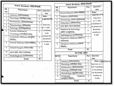 Walk-in Interview for Senior Resident, Junior Resident & Tutor Posts (Contract Basis)